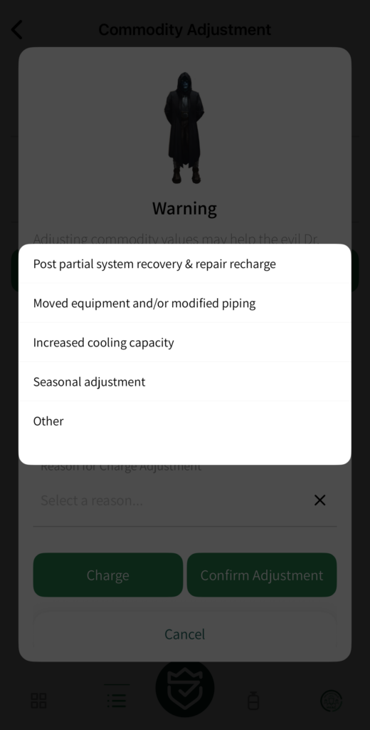 When you adjust field charge values during a service, FMHero now requires a reason for the commodity adjustment. Select from common scenarios like seasonal adjustment, post-repair recharge, or capacity changes—or provide your own explanation. This helps maintain the documentation trail that equipment owners and regulators expect.